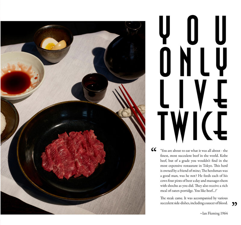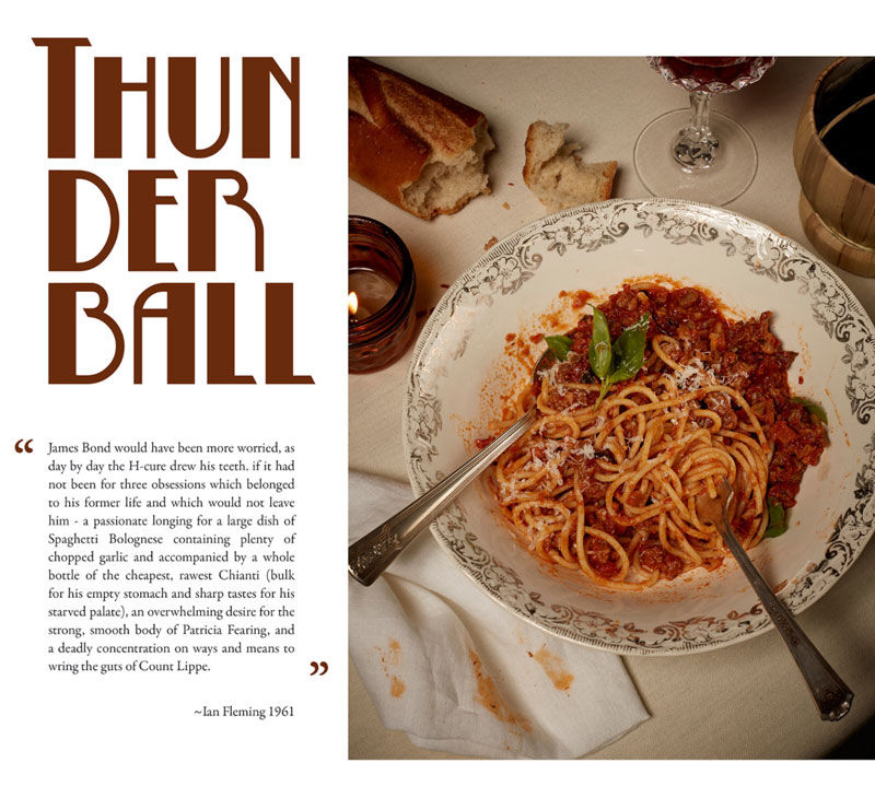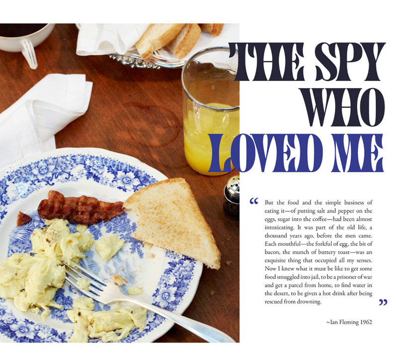 English photographer Henry Hargreaves had the inspiring idea to recreate Bond's meals in photos. He contacted food stylist Charloyye Omnés and together they meticulously brought these gourmet dinners from the page to real life. Since the books of James Bond mainly takes place during the 1950's, they had to go great lengths to find the proper attributes, such as salt strainers, glasses and cutlery.
