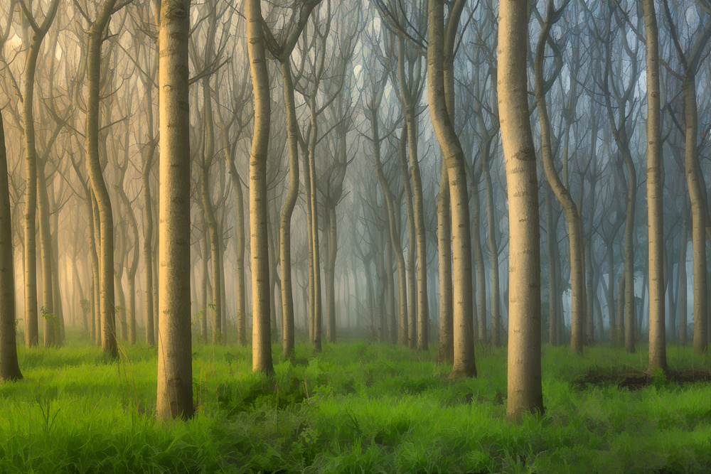 This is a very touching image, presenting a warm and welcome atmosphere of the forest scenery. The light shedding from left side provides perfect multiple layers through out the entire field and illustrates a gradual transition from warm to cool colors. The photographer also revealed an interesting orderly nature from these tree trunks and branches patterns.