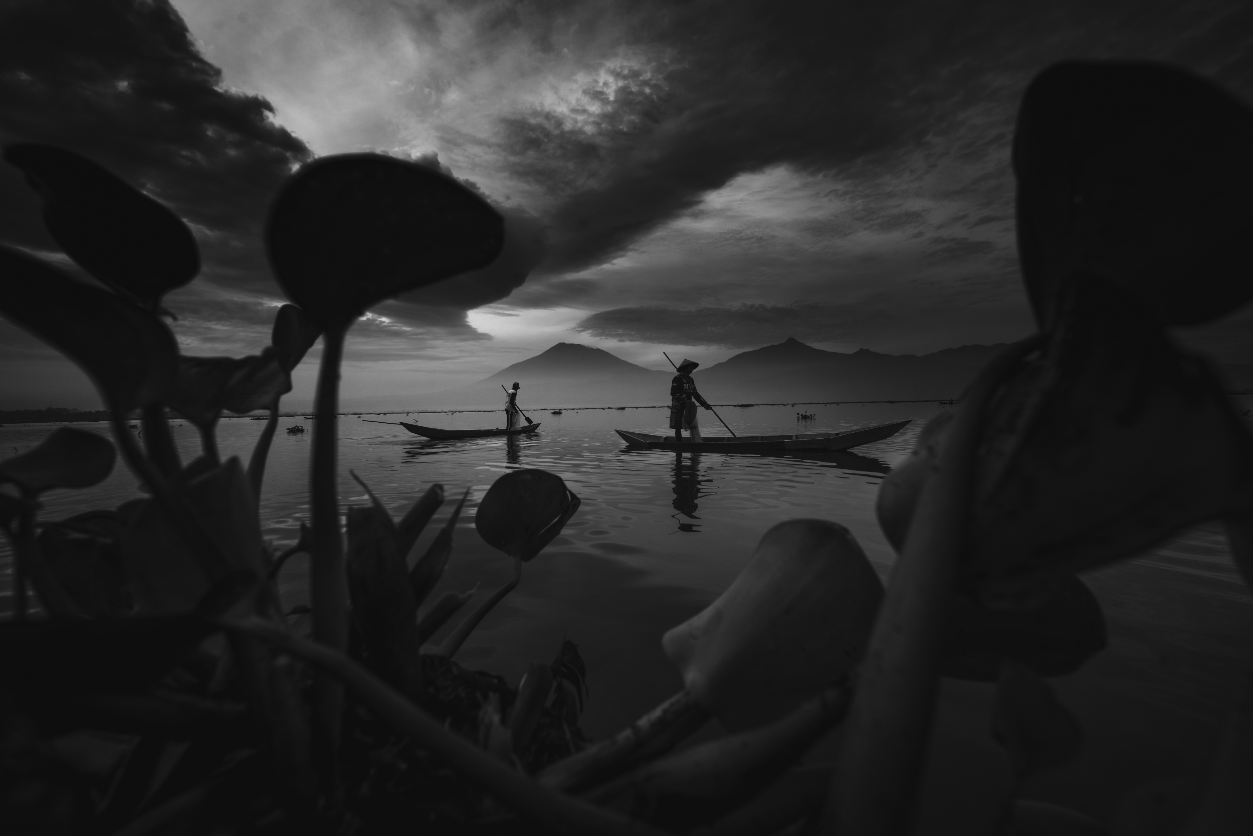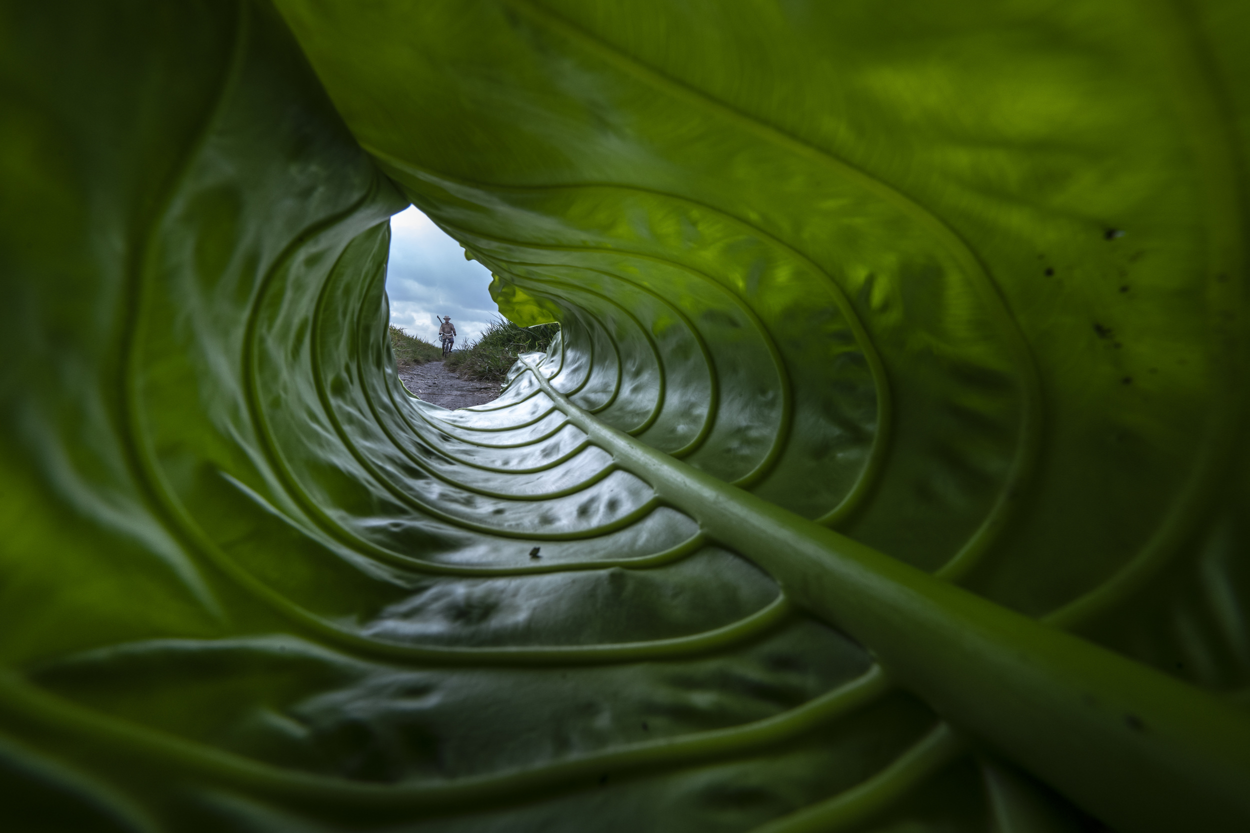 I took the photo while I drove along the riverside. It's wasn't easy to wait for the best moment. There were people cycling and I found taro leaves not far from this place. Suddenly I got an idea to draw the focus to the subject in the photo by blocking other parts of the image with a taro leaf. Shooting from that position with this framing made me feel happy. The position of the people in the picture almost came out perfectly well. It’s looks like a leaf cave.