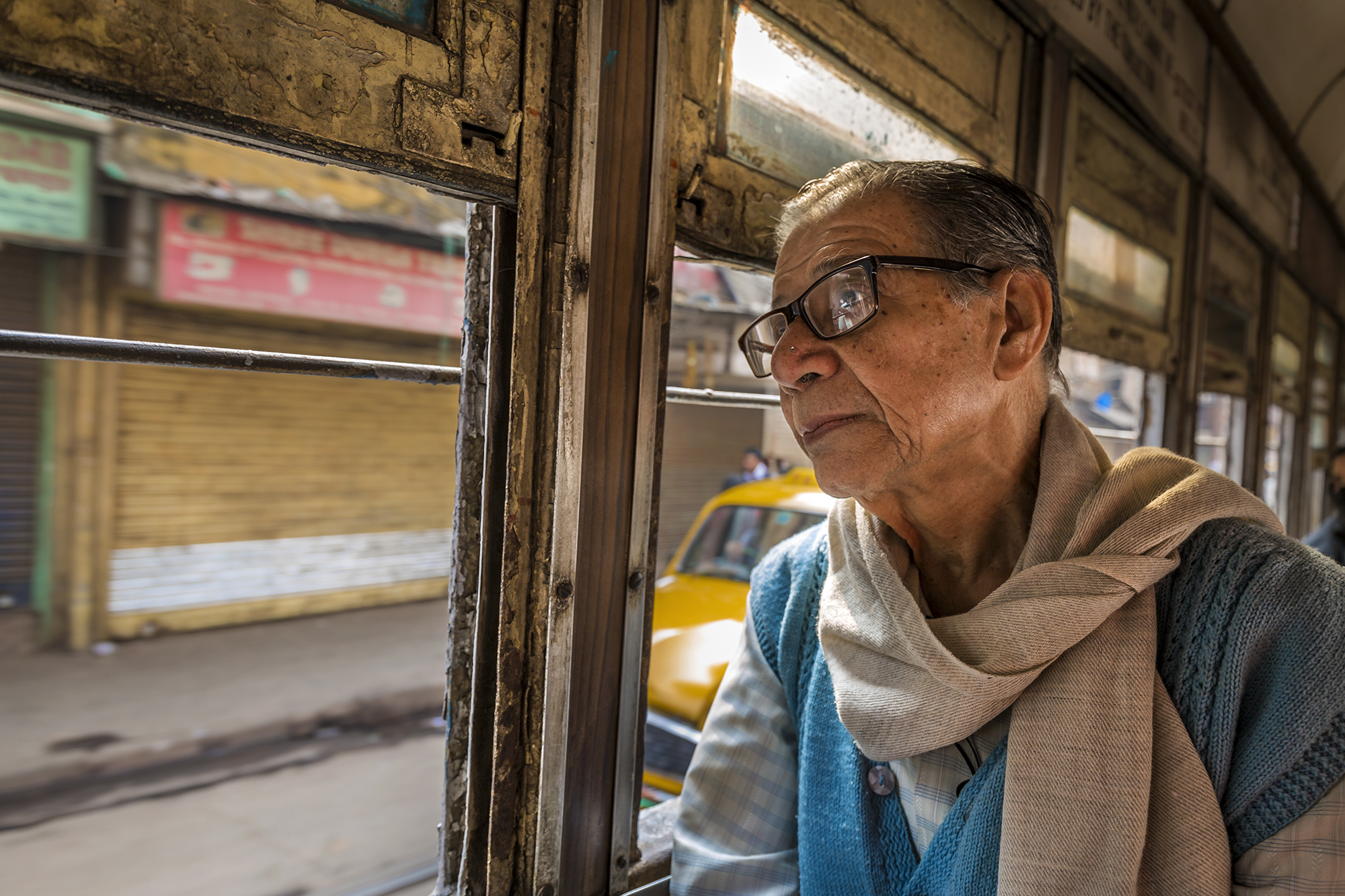 One of my favourite photos for a long time is a portrait of my father, which I took in a tram in Kolkata in November 2014. I used to urge my father, now deceased, to go out with me in the mornings on the streets of Kolkata. I had the dual purpose of photographing and spending quality time with my father during my holidays from my work in Abu Dhabi when I used to visit Kolkata. Returning from our morning tour that particular morning, we decided to take a tram back to our home at Shyambazar in North Kolkata. The trams of Kolkata are quite old and a heritage in themselves. After boarding the tram, which was quite empty that day, I got a trigger to shoot inside the tram. It was then that I took some portraits of my father, relaxed after our morning outing, sitting at his window seat enjoying the smooth but slow tram ride through the busy streets of Kolkata. This photograph and the images in my mind will remain with me for the rest of my life!